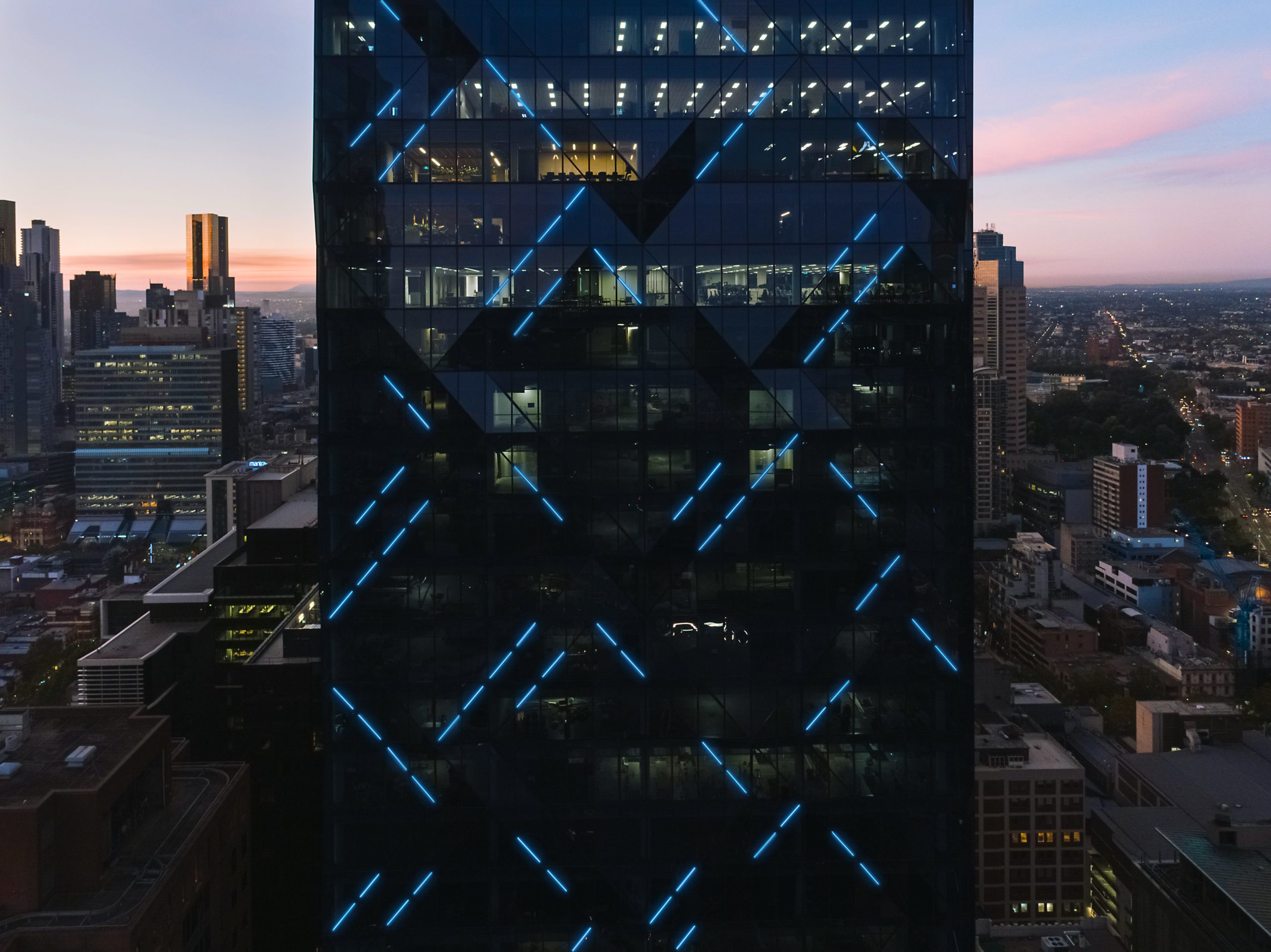 42-storeys of light spans across a faceted glass façade, articulating the architectural features and creating the sense of a graceful, glinting movement. Still Light was inspired by naturally occurring moments of light seen in the gas lamps that historically lined Collins St. The light patterns in the façade reflect and refract like facets of a cut diamond.