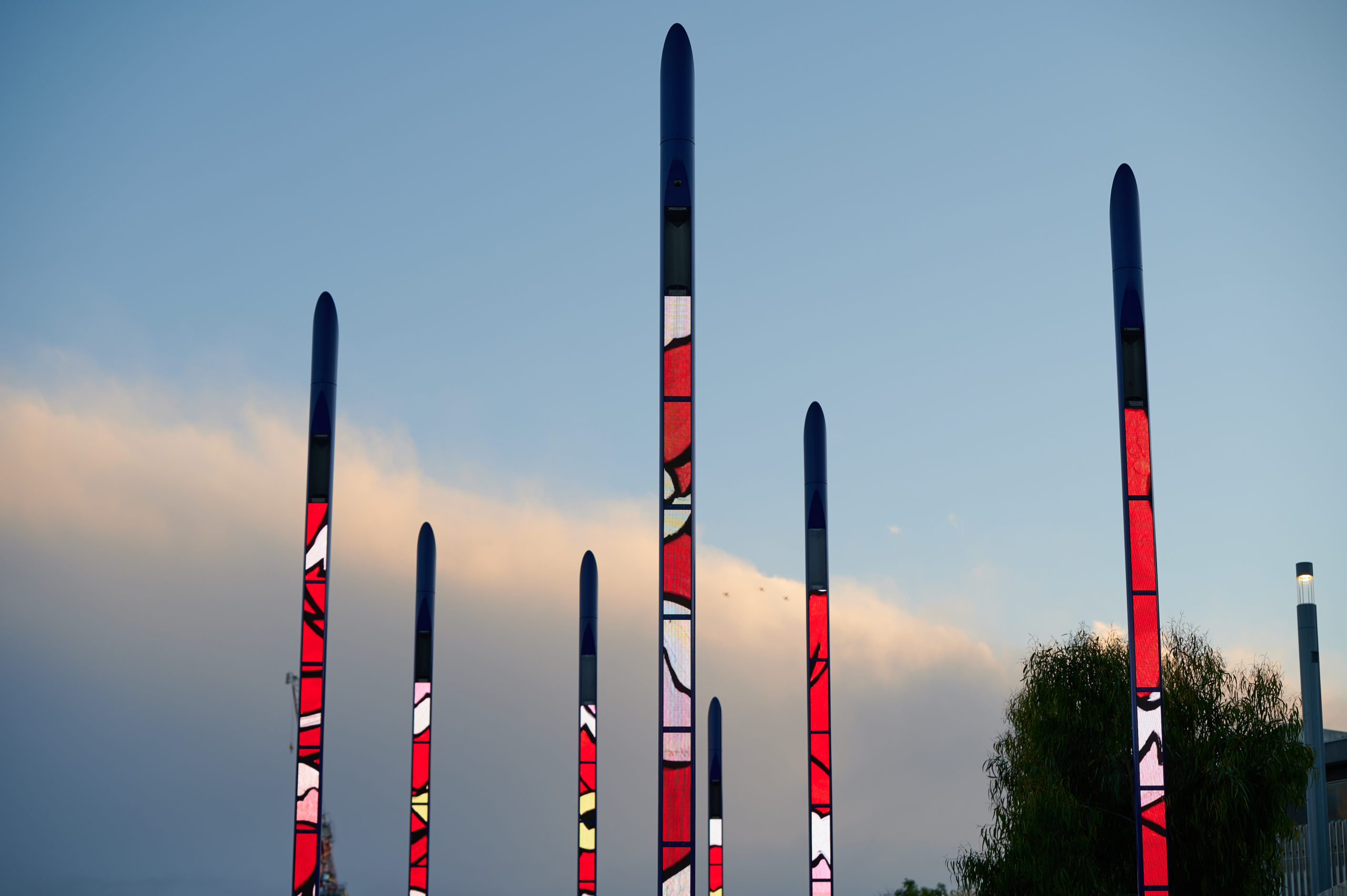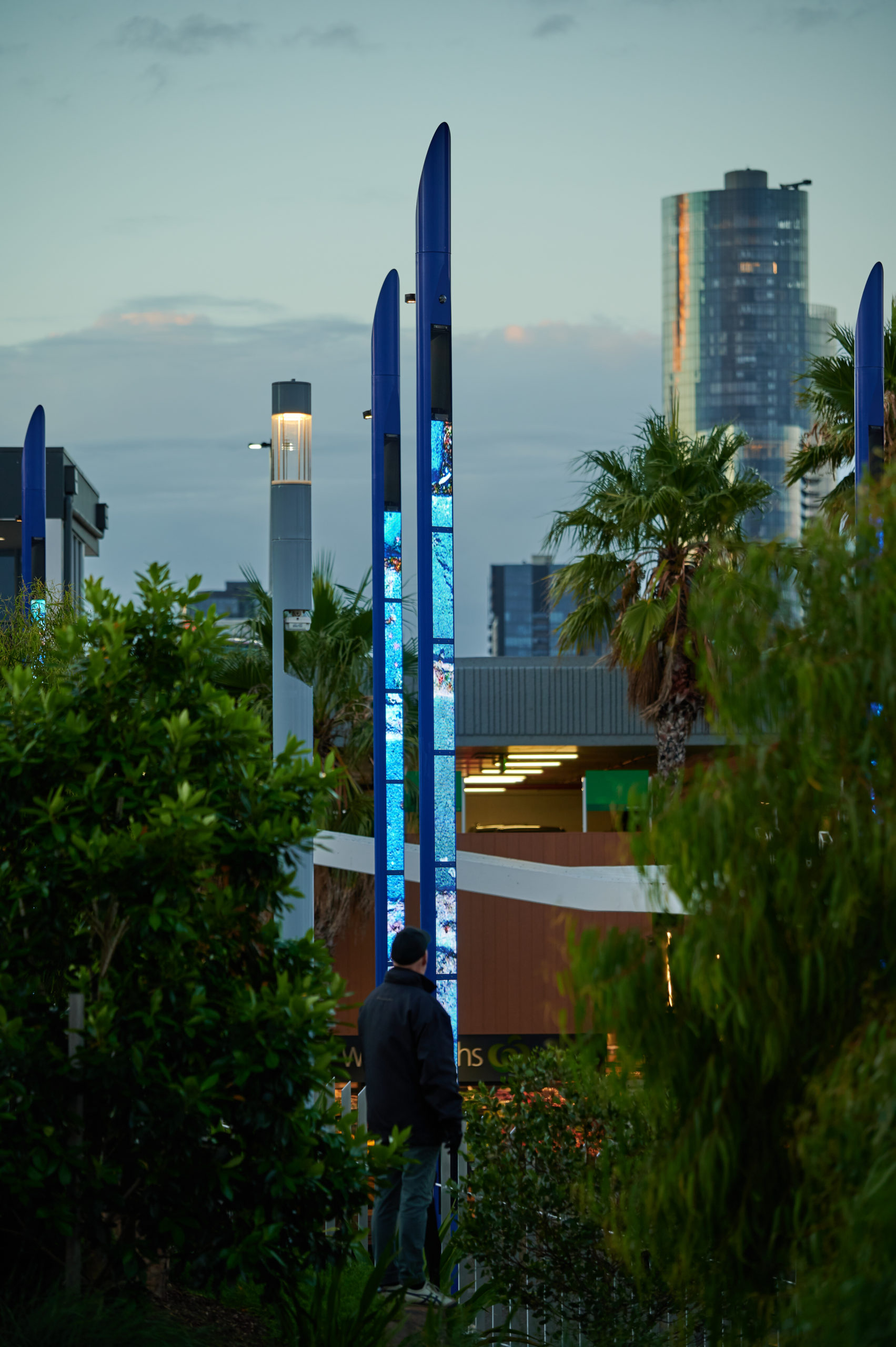 28 11m-tall interconnected poles were dispersed through four corners of Prahran Square. Each pole is covered in thin panels of high-res LEDs. Every moment presents a new immersive experience.